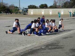 2年生の体育の授業は、女子は持久走をしています。そろそろ終盤に入っていますが、頑張って走っています。男子はバスケットボールをしています。ドリブルを使わないで動いてパスをもらう練習をしていました。