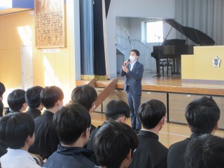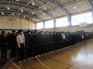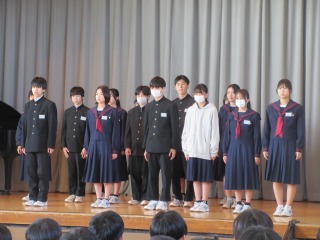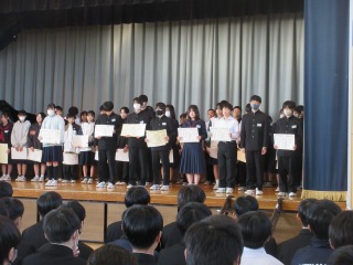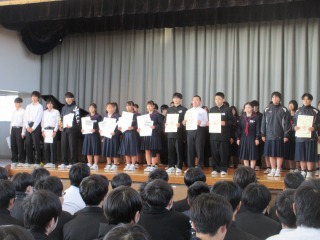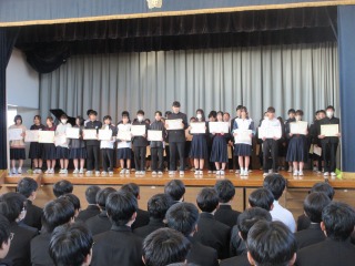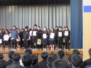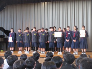 冬休み前の全校集会を開きました。表彰では、技術家庭科・美術科・社会科・国語科・ボランティア活動・柔道部・陸上部・ソフトボール部・バスケットボール部・吹奏楽部の表彰を行いました。今回も大変多くの表彰でうれしく思います。明日から冬休みになります。充実した時間を過ごしてください。