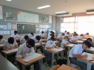 3年生では、2回目の領域確認テストを実施しました。領域確認テストは、入試に向けての内容となるため、今の自分の力を知ることができます。入試までに全5回実施していきます。公立高校の英語の入試は、実施時間が60分になっているため、学校でも同じように対応しています。