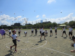 体育の授業では、女子はバレーボール、男子はソフトボールの授業をしています。