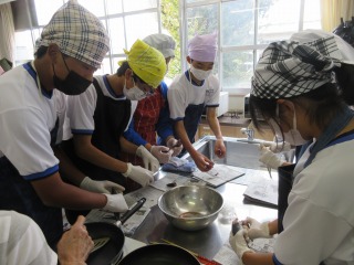 2年生の家庭科の授業で、千葉県農林水産部が行っている「おさかな普及員の派遣」事業に申し込みをして、来ていただきました。いわしを手開きして骨をとり、蒲焼きと骨せんべいにしました。皆さんよくできていました。