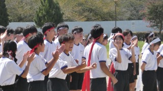 閉会式のあとは、解団式を行います。全校で1つの円になり、演舞を踊ります。お互いをたたえ合う、温かい雰囲気です。応援団から挨拶がありました。