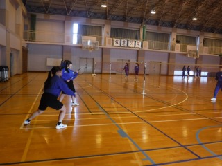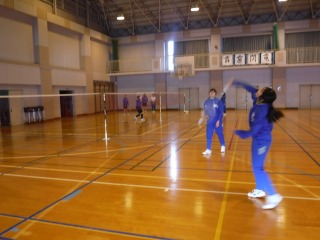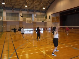 1・2年生はテスト中ですが、3年生は通常授業です。女子はバドミントンを行っています。コートによってはバドミントン部同士の対決となり、熱い戦いです。