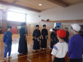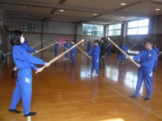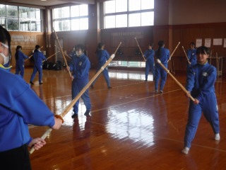 1年生女子保健体育では、剣道が始まりました。慣れない竹刀の重さに戸惑いながら、すり足でリレーをしたあとは、ペアで向かい合って動きの練習です。