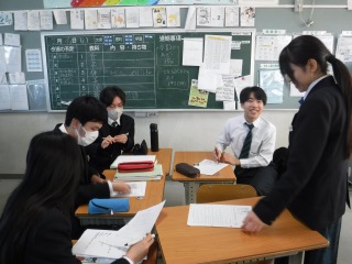 3年生の英語の授業です。様々な文法要素を網羅した英作文をグループ対抗で解いています。協力して考えています。