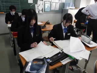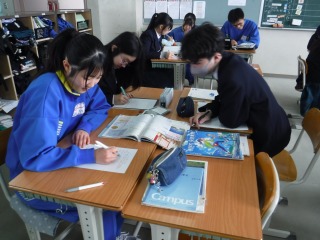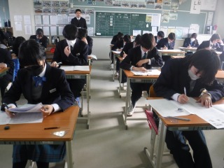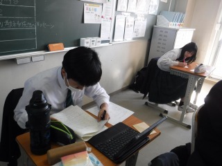 17日、18日に公立高校入学検査を受検した3年生は、2日ぶりの登校です。今日は、自己採点をしています。入試が終わり、クラスの友人と会えて嬉しそうな顔が見られます。