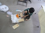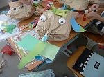 毛糸を作品くねくねと貼り付けてふわふわ感を出している子、テープやひもで袋をしばって耳や尻尾を表現する子、袋をもんでしわしわにしてやわらかい蛇を表現する子、硬い紙でギザギザの歯を表現している子など様々でした。
