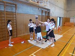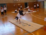 他にもゴムを貼ったマットを使って跳び前転、もっと大きい障害を飛び越えると技が大きくなっていきます。たくさんの場で、楽しみながら技の向上を図っています。