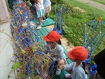 「まあるいのをプシュっておしたら、たねがでてきた!」「たくさんとれたよ。1、2、3・・・・20こだ!」「まだ、お花がさいているんだ。」春とは違うアサガオの様子に気づいていました。