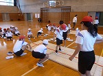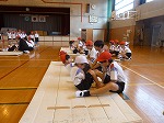 5年生のマット運動は、様々な練習の場を用意しています。合図の音楽が鳴ったらグループごとに場所を移動して、たくさんの技の練習を行っています。