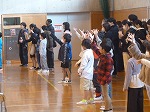 その後のお楽しみコーナーは、5年生の合奏をご指導いただいた講師の先生が、体を使ったリズム遊びをしてくださいました。「グループを作ります。そのグループの中に大人が必ず1人はいること!」の声に会場が「ええっ。」「行こう!」戸惑いながらも自分の保護者や友達の保護者、地域の方を誘ってわいわいとグループができていきました。「おばちゃんがここにいるよ。」と地域の方も声をかけてくださっていました。できたグループで3拍子のリズムに合わせて踊ったり、手拍子をしたりと会場は大盛り上がりでした。コミュニケーション力アップです。