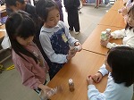 「このマラカスは、音が違います。」ペットボトルに大きいどんぐり1つを入れたもの、小さいどんぐりをたくさん入れた物は、振ってみると確かに音が違います。「この迷路はどんぐりが通りにくいところがあります。気をつけてください。」と言われてどんぐりを転がす迷路は、なかなか難しかったです。他にも落下傘、けん玉、こまなど、一人一人が工夫したおもちゃが並び、皆で楽しい1時間を過ごしました。