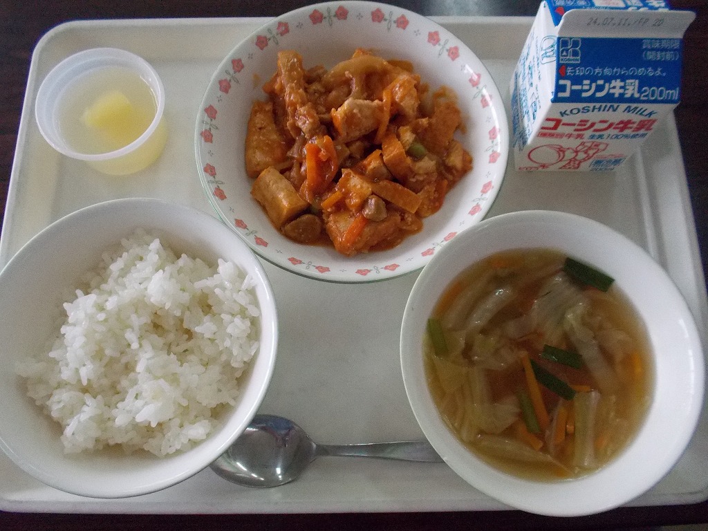 7月最初の今日は、夏バテ気味の子どもたちにも食べやすい献立を考え、食欲増進のニンニクや香味野菜をたっぷり入れた「チリソース煮」の登場です。