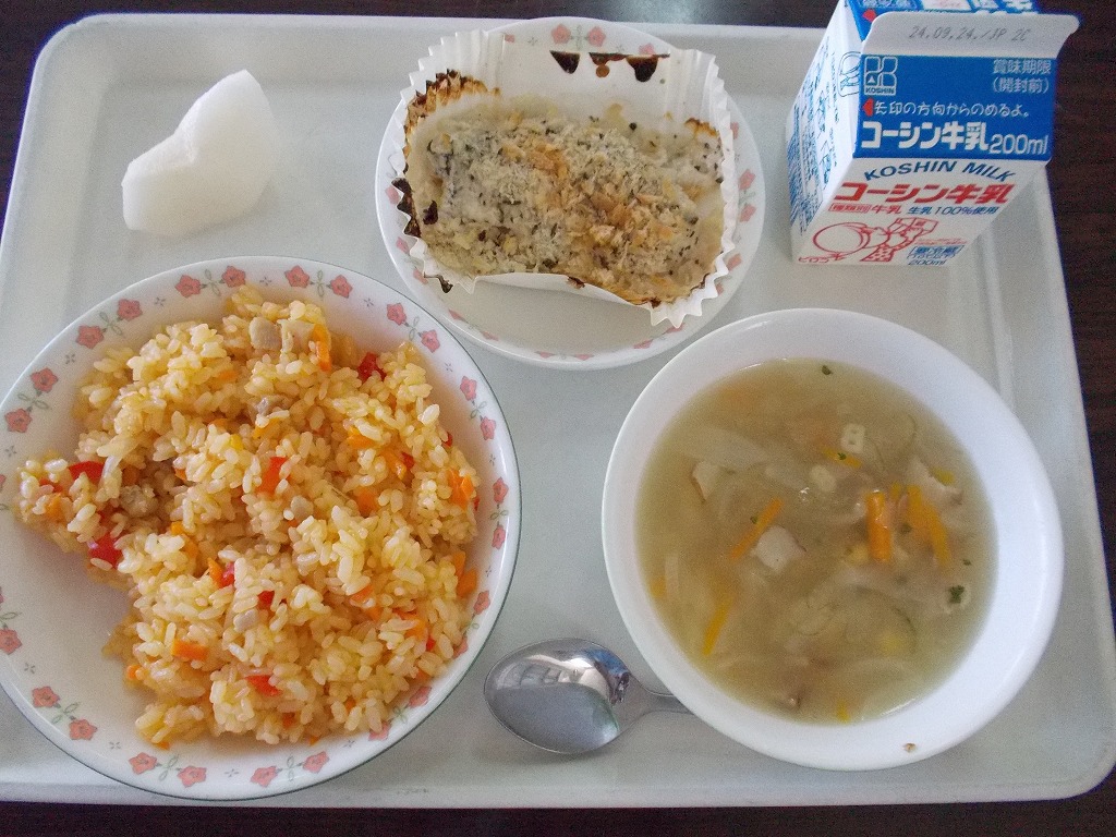 今日の給食は、白井の梨味くらべ第2弾です!今日の品種は”あきづき”です!この品種も、最近では人気が高く、先週の”豊水”と同様に甘みが強いです。食感としては、シャリシャリとした食感であり、さわやかな香りと、強い甘みが特徴です。白井の梨は、全国の中でもトップクラスです!地元の名産をしっかり味わいましょう。そして、ごはんには、子どもたちにも人気のある「キャロットピラフ」です。人参ジュースで炊き上げたごはん、人参や鶏肉、パプリカなどの具材を混ぜ込んだ人気のあるピラフです。今日は、体力テストで体力がかなり消耗した子どもたちです。しっかり食べて、塩分と体力をチャージしましょう。