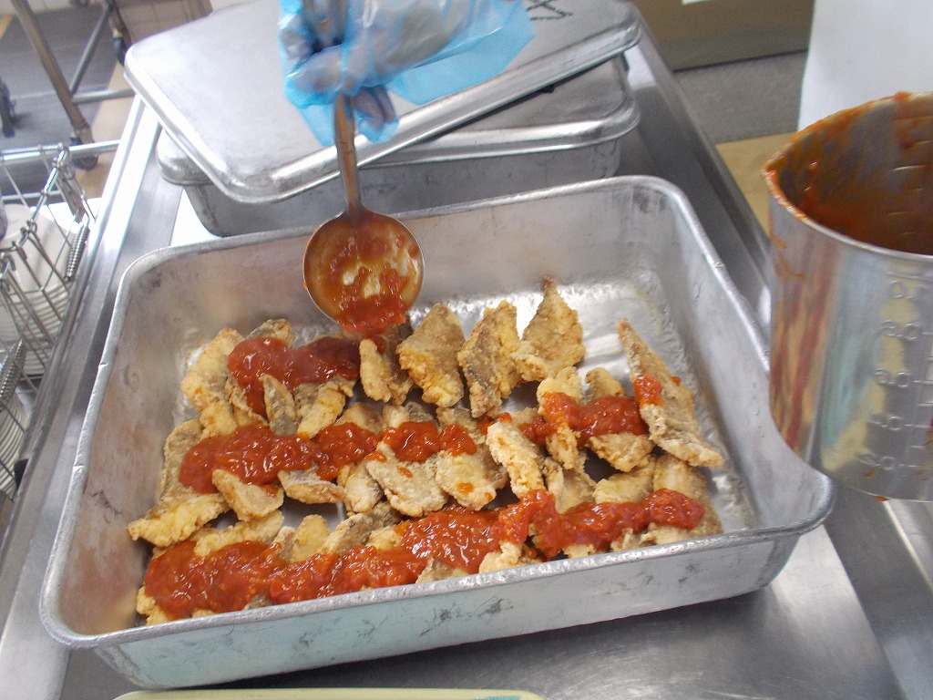 今日の給食は、現代人に不足しがちな栄養素である”鉄分”を意識した「鉄分たっぷり献立」です。鉄分豊富なレバーを使った「味噌和え」です。レバーは、独特な香りと味で、苦手な人が多い食材でもあります。ですが、鉄分だけでなく、ビタミンAやB群、そして、葉酸や亜鉛など、普段から意識しないと摂れない栄養素がギュッと詰まった『栄養の宝庫』と呼ばれています。そのレバーを少しでも食べやすくするために、湯引きした後、たっぷりの生姜に醤油で下味を付け、油でカリッと揚げています。そのレバーを、みんな大好きポテトと一緒に、甘辛い味噌ダレで和えているので、レバー臭さもほとんどないため、苦手な人も食べれられます。隠れた人気メニューでもあります。副菜には、これまた鉄分豊富な”ほうれん草”をメインに使ったサラダです。しっかり食べて、不足しがちな鉄分を補給しましょう!