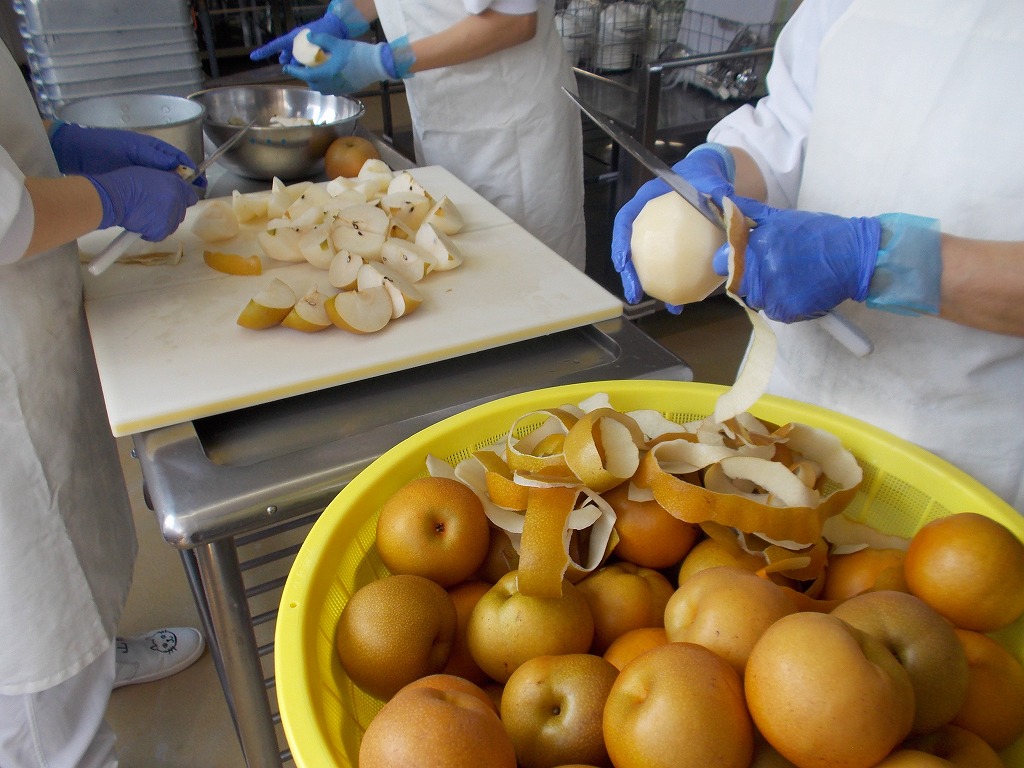 今日の給食は、白井の名産である梨が登場!!千葉県の中でも生産トップであり、白井を誇る名品です。数ある品種の中でも、人気が一番高く、生産数も多い「豊水」が登場です。名前の通り果汁がたっぷり豊富であり、甘みと酸味がバランス良い品種です。子どもたちも「甘い!おいしい!!もっと食べたい!」という声がたくさん聞こえました。来週は、また違う品種を提供予定です。ぜひ、白井の梨を味比べしてみましょう。そして、メインのおかずには、ナスをたっぷり入れた「厚揚げとナスの味噌炒め」です。ナスに味噌のコクと旨味が染み渡り、ごはんが進む味でした。