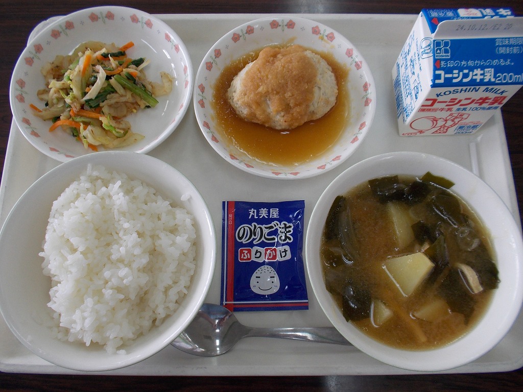 今日の給食は、久々の登場「あんかけ焼きそば」です。お肉やたっぷりの野菜、ウズラの卵など、具沢山のあんが、パリパリに焼き上げた麺にとっても合います!そして、加熱することでカサが減り、たっぷりの野菜を食べることができます。麺は、おろしショウガとごま油をまぶし、オーブンでカリカリになるまで焼き上げている部分と、モチモチの食感の部分がある美味しい麺に仕上げています。主菜には、子どもたちからのリクエストでも人気の「揚げギョーザ」です。カリカリに揚がったギョーザは、どの学年も人気のあるメニューです。
