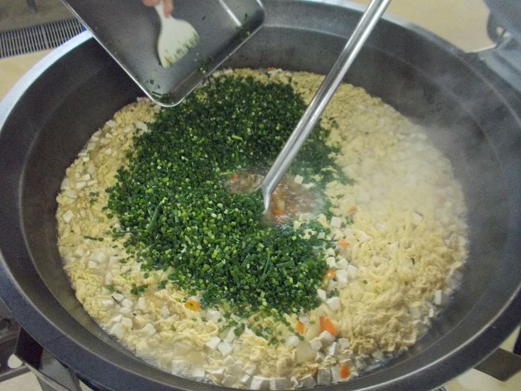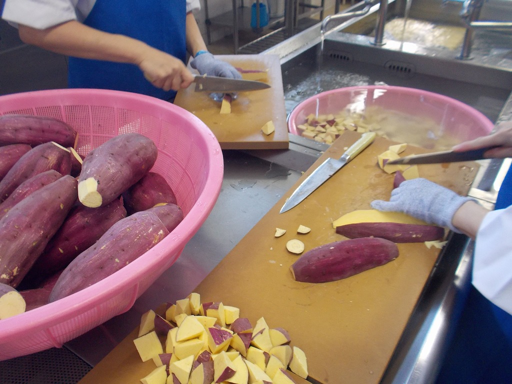 今日の主菜に登場している「大豆とさつまいものカリカリ和え」は、千葉県の食材を使って作っています。大豆は、乾燥大豆を朝から漬け込み戻したものに片栗粉をつけてカリッと揚げ、さらに、さつまいもも小さくサイコロ状にカットし、素揚げしています。その2つを黒糖を煮詰めて作った蜜に絡めています。黒糖のコクと甘みが、大豆とさつまいものおいしさを引き立たせてくれます。大豆は乾燥から戻して、そのままの揚げているので、噛み応えも抜群!かみかみメニューでもあります。豆が苦手な児童も多くいますが、「今日の豆はおいしい!これなら、おかわりしたい!!」と、おかわりをしてくれる子たちが、今日は、たくさんいて嬉しい気持ちになりました。千葉のおいしさを感じてもらえたかな!?