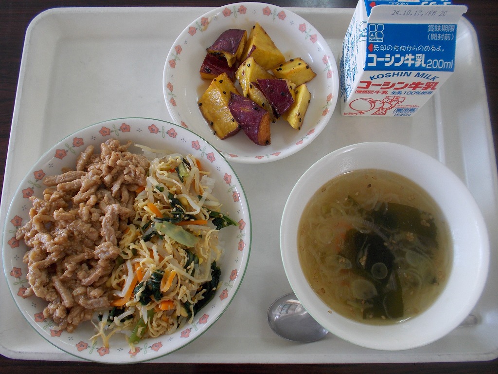 今日は、一皿で野菜もお肉もご飯も食べられる「ビビンバ」です。1つのお皿でバランスよく栄養を満たし、さらにお腹も満足にしてくれる優秀な料理です。甘辛い”お肉”と、ニンニクとごま油の香りが食欲をそそる”ナムル”を、ごはんとよく混ぜて食べましょう。そして、今日は、秋の味覚”さつまいも”がメインの「大学いも」が登場です。ホクホクのサツマイモに、甘塩っぱいタレが絡んで、とても美味しく仕上がっています。ボリューム満点の給食です。味わっていただきましょう。