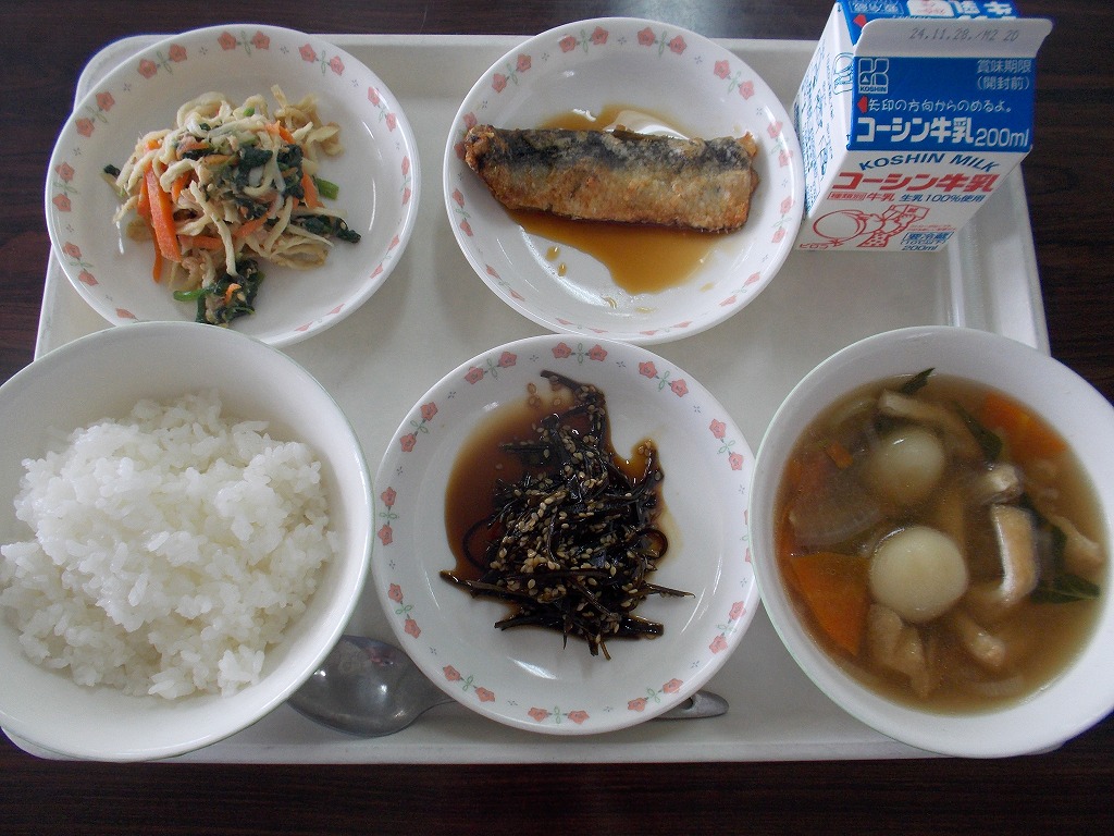 11月最初の給食は、地産地消献立として、千葉の食材が使われた献立です。今が旬の「鯖」は、カレー粉とともに漬け込み、片栗粉をつけてカリッと揚げ焼きにしました。そして、白井産の小松菜を使った和え物、千葉県を代表する”サツマイモ”がたっぷり入った「さつま汁」です。千葉の食材の魅力を味わってほしいですね。