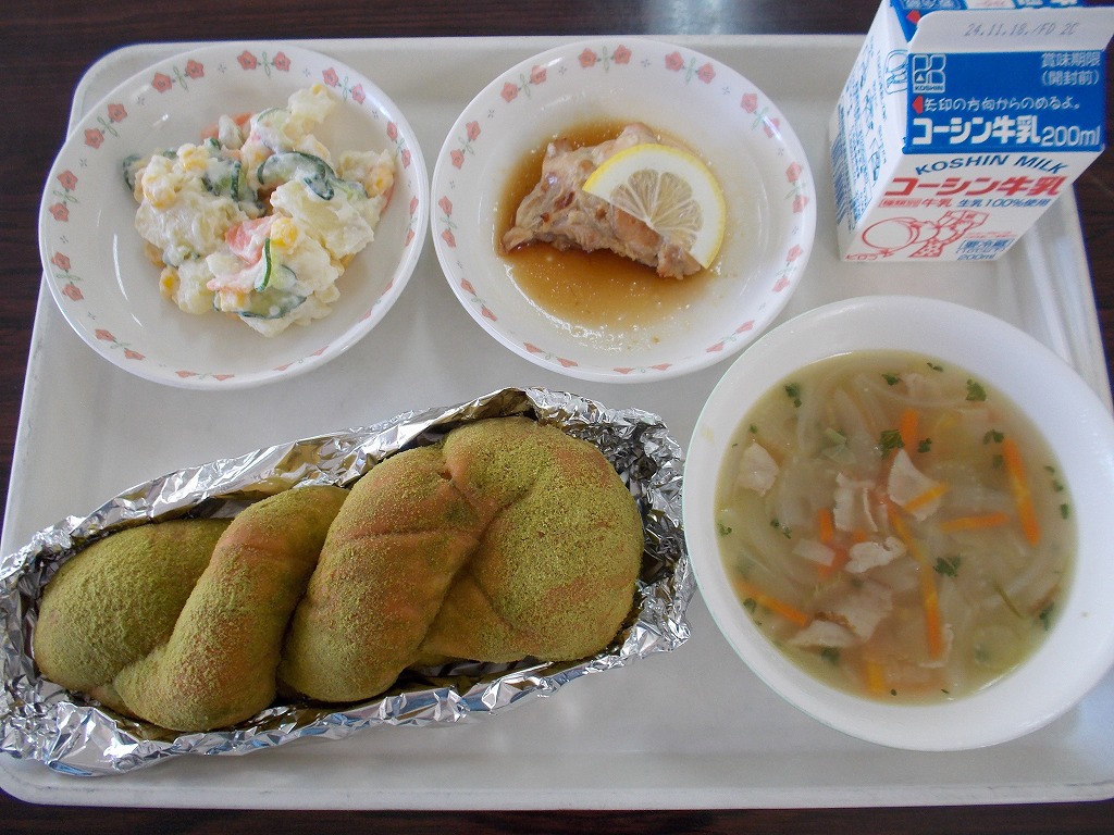 今日の給食も、3・4年生のリクエスト給食です!今日のリクエストは、みんな大好き「揚げパン」です。揚げパンでは、”ココア揚げパン”がダントツで人気ですが、実は、密かに人気があるもう一つの揚げパンが、今日、登場しているこの「抹茶揚げパン」です。抹茶の苦みと、きな粉の香ばしさ、砂糖の甘さがバランス良くマッチした揚げパンです。年に1度しか登場しないレアな揚げパンでもあります。忘れず、名前がリクエストにあがったのは嬉しいですね。そして、もう一つのリクエストは「ポテトサラダ」です。マヨネーズだけでなく、お酢や牛乳を加えて作ったサッパリした味わいのドレッシングで和えています。今日もおいしく食べてほしいですね。