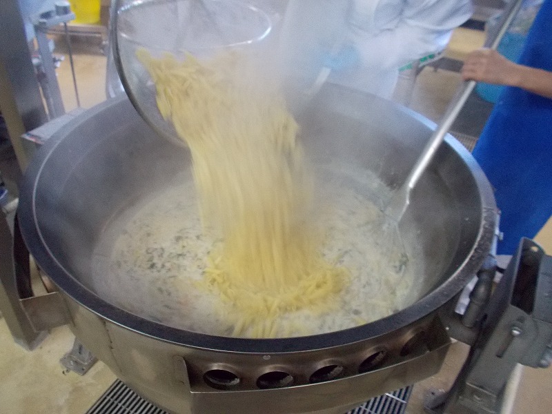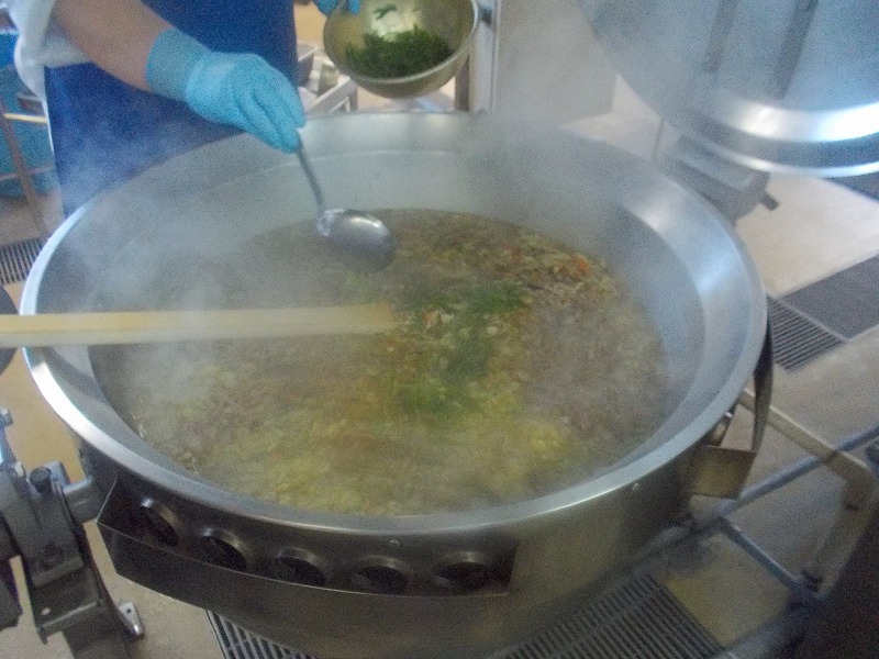 今日は、寒い冬にピッタリの「クリームスパゲティ」です。牛乳とバター、小麦粉で丁寧に作られたホワイトルウに、たっぷりの玉ねぎの甘みが引き出された具材を合わさった特製のホワイトソースです。玉ねぎのほかにも、冬が旬の”ほうれん草”や、旨味が濃い”しめじ”なども入っています。そこへ合わせたのが、ペンネパスタです。中が空洞になっているペンネパスタは、ソースが中に入り込み、とてもおいしくなります。さらに、細いスパゲティより、伸びにくいため大量調理向けの食材でもあります。さらに、スープにも、冬が旬の”かぶ”や”ブロッコリー”、”キャベツ”がたっぷり入っています。体が温まるメニューです。最後に、「チョコマフィン」は、1・2年生のリクエストです。純ココアをたっぷり入れ、アクセントにチョコチップの入った贅沢なマフィンです。今日もおいしくいただきましょう。