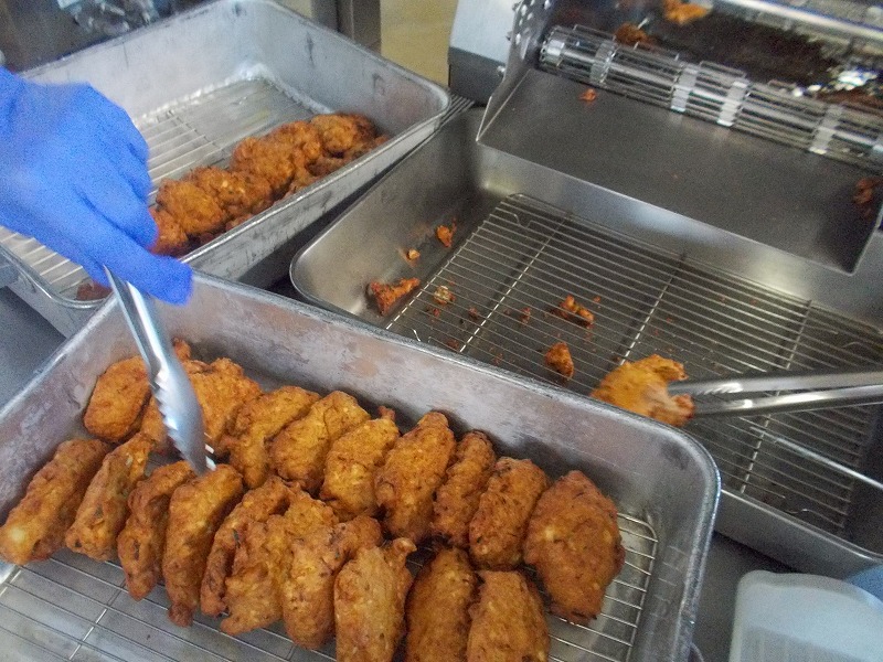 今日は、鶏のむね肉を使って「チキンカツ」を作りました。むね肉は、加熱するとパサつきや固さが気になりますが、下味の段階で、砂糖水に漬け込むことで、加熱しても柔らかく仕上がります。子どもたちにも好評でした。そして、副菜の「たくあん和え」と味噌汁の「さつま汁」には、白井産の”小松菜”と、千葉産の”さつまいも”の地産地消メニューです。