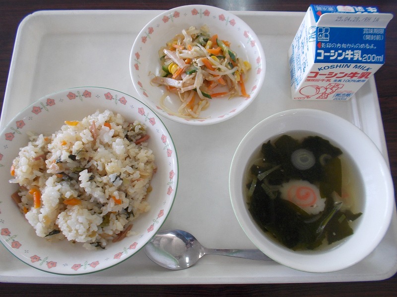 今日は、中華をメインにした献立です。ごはんには、野沢菜というお漬物が入ったチャーハンです。野沢菜の塩気が、ごはんと相性ぴったりです。焼豚チャーシューも入っています。さらに、スープには、食物繊維が豊富な”わかめ”が、たっぷり入ったスープです。食物繊維は、体を中をキレイにしてくれる大切な栄養素です。そして、サラダには、大人気の「春雨サラダ」です、どの学年からも人気のあるサラダです。好き嫌いせず、なんでも食べてくださいね。