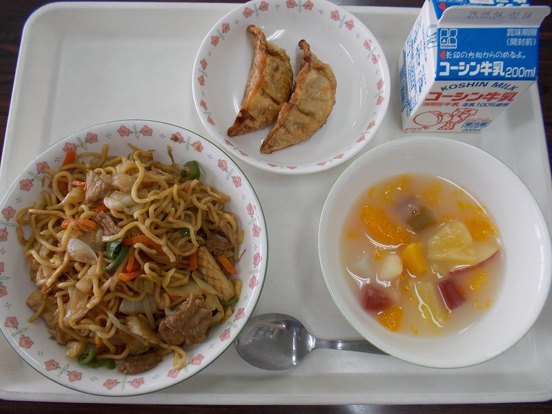 今日は、「ソース焼きそば」が登場です。給食では、大量の野菜を使っているため、野菜からの水分がたくさん出るため、味が薄くなってしまったり、麺がべちゃべちゃになりやすいのが難点でしたが、試行錯誤した結果、先に野菜を蒸し、麺は別にカリッと焼き上げてから一緒に絡めることで美味しく出来上がりました。改良を重ね、野菜のうま味が凝縮され、さらにおいしくなった「焼きそば」を味わって食べてほしいですね。おかずには、子どもたちに大人気の「揚げギョーザ」です。そして、デザートには、カルピスとたっぷりのフルーツがはいった「カルピスポンチ」です。食後にぴったりのさっぱりしたデザートです。