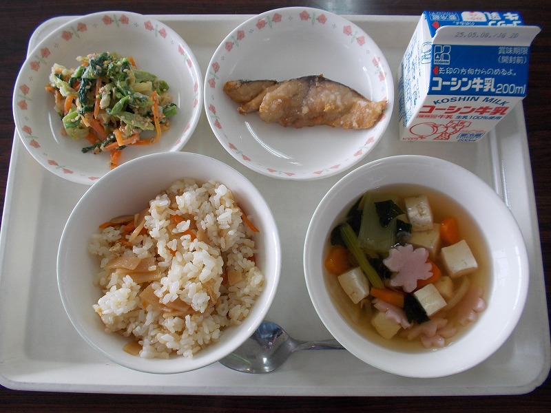 昨日から開催されている『大阪・関西万博』を記念して、開催土地である大阪・関西の料理を組み合わせました。大阪や関西といえば、”お好み焼き”や”たこ焼き”などの粉ものをイメージしますが、実は、粉ものだけでない美味しい料理がたくさんあることを知ってもえる献立にしてみました。主食は、「かやくごはん」です。この呼び名は関西に多く、いわば、五目ごはんのことです。そして、メインのおかずには、鶏肉こと”かしわ”を、ニンニクをいれたパンチのある衣であげた「かしわの天ぷら」、副菜には、白井の小松菜と揚げをお出汁で煮付け、合わせたものを「炊き合わせ」と呼び、お上品な味付けで作られています。最後に、大阪府枚方市の郷土料理である、”ごんぼ”ことゴボウと、卯の花(おから)が入ったお汁の「ごんぼ汁」です。お腹の調子を整えてくれる食物繊維が豊富なお汁です。粉ものだけでない大阪・関西のおいしさを知ってもらえると嬉しいです。来月には、万博を記念し、世界の料理がたくさん登場予定です。お楽しみに!!