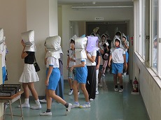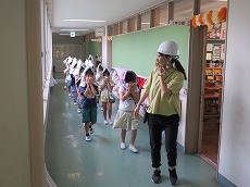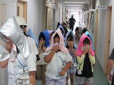火元は家庭科室を想定しました。火元近くを避難経路とすることはできません。従って地震の時とは異なる避難経路を通る学級もありました。
