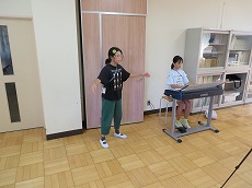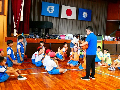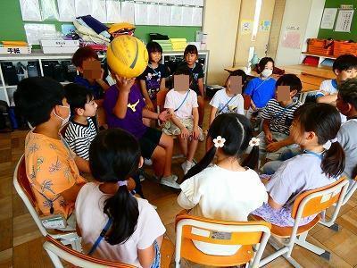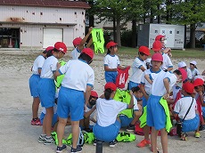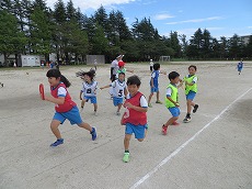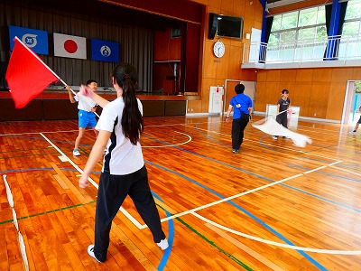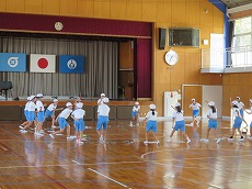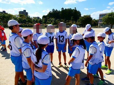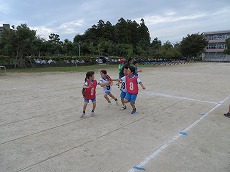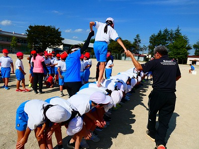 表現は2曲めに入り、隊形移動やフラッグの振り方も難しくなってきましたが、しっかりと習得することができました。団体種目は「背渡り走」に挑戦します。土台となる子たちは膝に手を置き、その背中を代表の子が渡っていきます。各チーム、話し合いで代表を決めました。空いた時間で少し練習もし、種目について理解することができたようです。