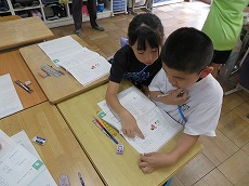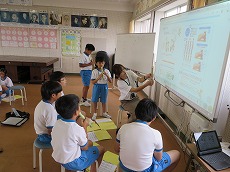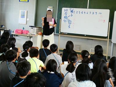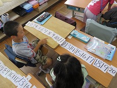 1年1組の数の並び方の学習では、5・10・15・20と5ずつの数え方を学習していました。1年2組では運動会に向けた踊りの練習をしており、手を振って腰を振って1年生らしいかわいらしさが爆発していました。机上の学習も体を動かす学習もバランス良くやっています。