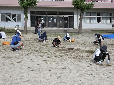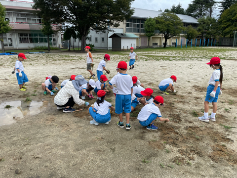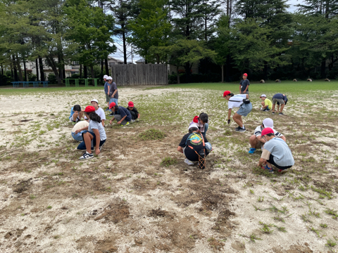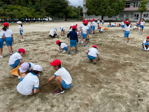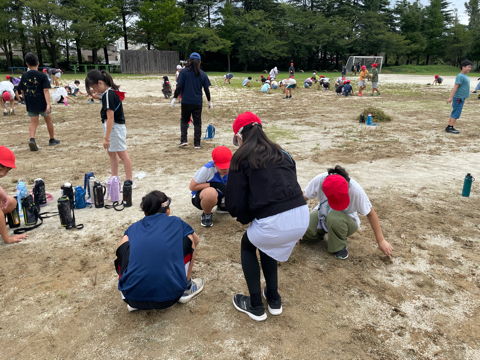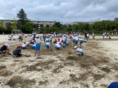 これまで職員が毎日コツコツと除草してきましたが、400名近い児童の力はすごいです。30分程度の作業でしたが、あれよあれよと草がなくなっていきました。昨日の雨で地面が緩み、頑固に根を張っていた草もスポスポと気持ちよく抜けました。