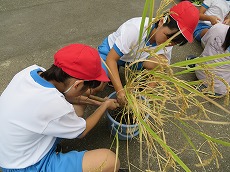 今日は稲刈りをしました。鎌で刈りましたが、稲の丈夫さに子どもたちは苦戦していました。