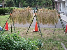 刈った後は、稲架掛けです。教師手作りの台に干していきました。なかなか見応えがありますよ。