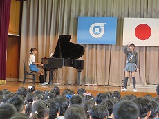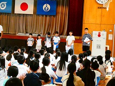 教頭先生のはじめの言葉から始まり、全校で校歌を歌いました。指揮と伴奏は6年生の児童が担当しました。