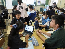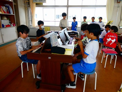 4年生の音楽では、リコーダーの練習をしていました。グループで音を合わせて学習したり、指使いについて丁寧に教わったりしていました。