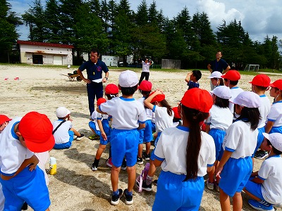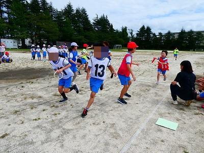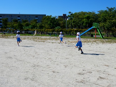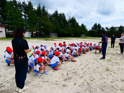 3年生が「リレー」のお手本を見せてくれて、1・2年生は目を輝かせながら、走りを見つめていました。次回の練習では、どうやったらチームで速く走ることができるか考えていきます。
