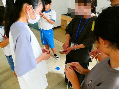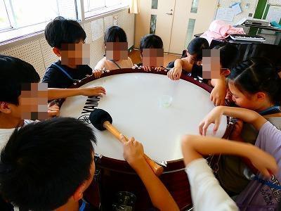 太鼓を叩くと、カップに入ったビーズが飛び跳ねるように動きます。「強く叩いてみて?」「弱く叩くとどう?」とグループで実際に鳴らして確かめていました。指で触って振動を確かめる児童も。体験することで、実感に繋がりますね。