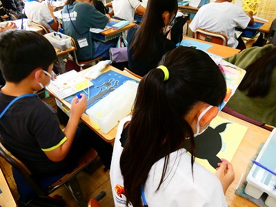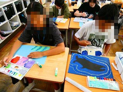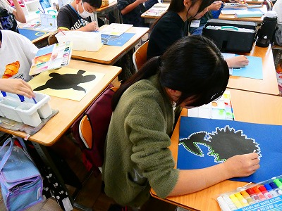 綿棒を使って「ドット」で着色していく作品です。下絵が終わった人から、着色を始めました。細かいドットなので、集中力が必要になってきます。自分の思い描く作品に近づくよう、一生懸命頑張っていました。