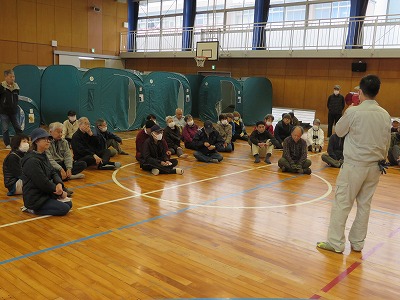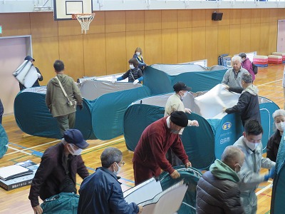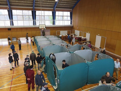 たくさんの地域の方が参加し、有事の際にどのように協力し、動いていったら良いかを訓練しました。大小のパーテーションを出して並べたり、受付の机の配置を考えたりした訓練になりました。