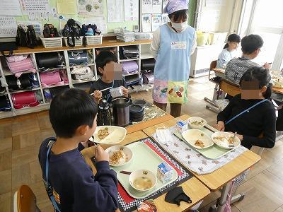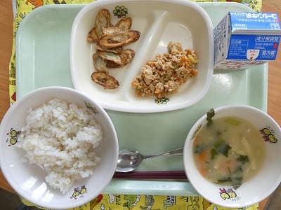 給食の配膳時も一緒にいてくださり、どのくらいの量が適量なのかも教えていただきました。今日のメニューのそぼろは大人気のメニューだったので、みんな「おいしい!おいしい!」とたくさん食べていました。