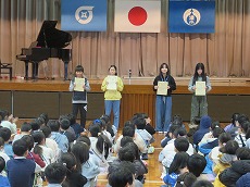 まずは、歯と口の健康作品審査会の表彰がありました。6年生4名の児童が表彰されました。