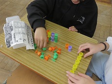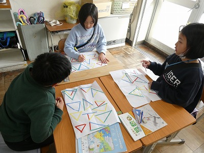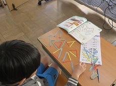三角形の学習に入りました。今日は作った三角形を、辺の長さに着目して仲間わけをしました。長さによって違う色の棒を使っているので分かりやすく、グループで話し合いながら仲間わけすることができました。