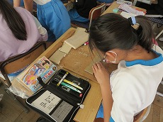 6年生は、オルゴールの箱を飾るために、自分で考えたデザインをもとに、彫刻刀で彫っていました。手慣れた感じで、上手に彫り進めていました。