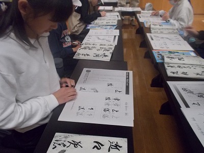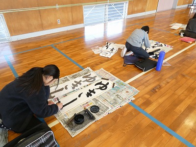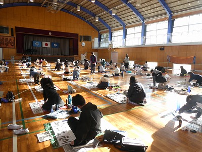 12月に講師の先生から教えていただき、冬休み中にたくさん練習をし、書き初め大会に臨みました。どの学年も、立派な作品を仕上げることができました。