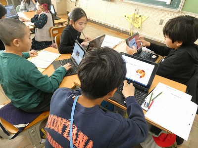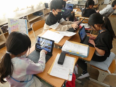 5年生は、コンビニエンスストアでの情報活用について、新聞にまとめるための計画を立てていました。役割分担決めでも、協力して取り組んでいました。