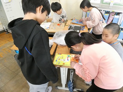 友だちの作品の良いところを見つけたり、実際に遊んだりしました。ビー玉を転がした先に点数がかかれていて得点を競うことができるようになっていたり、輪ゴムでコースが難しくなっていたりと、それぞれに工夫がみられました。