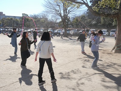 リズム縄跳び用の音楽を流し、それに合わせて決められた跳び方の練習をします。